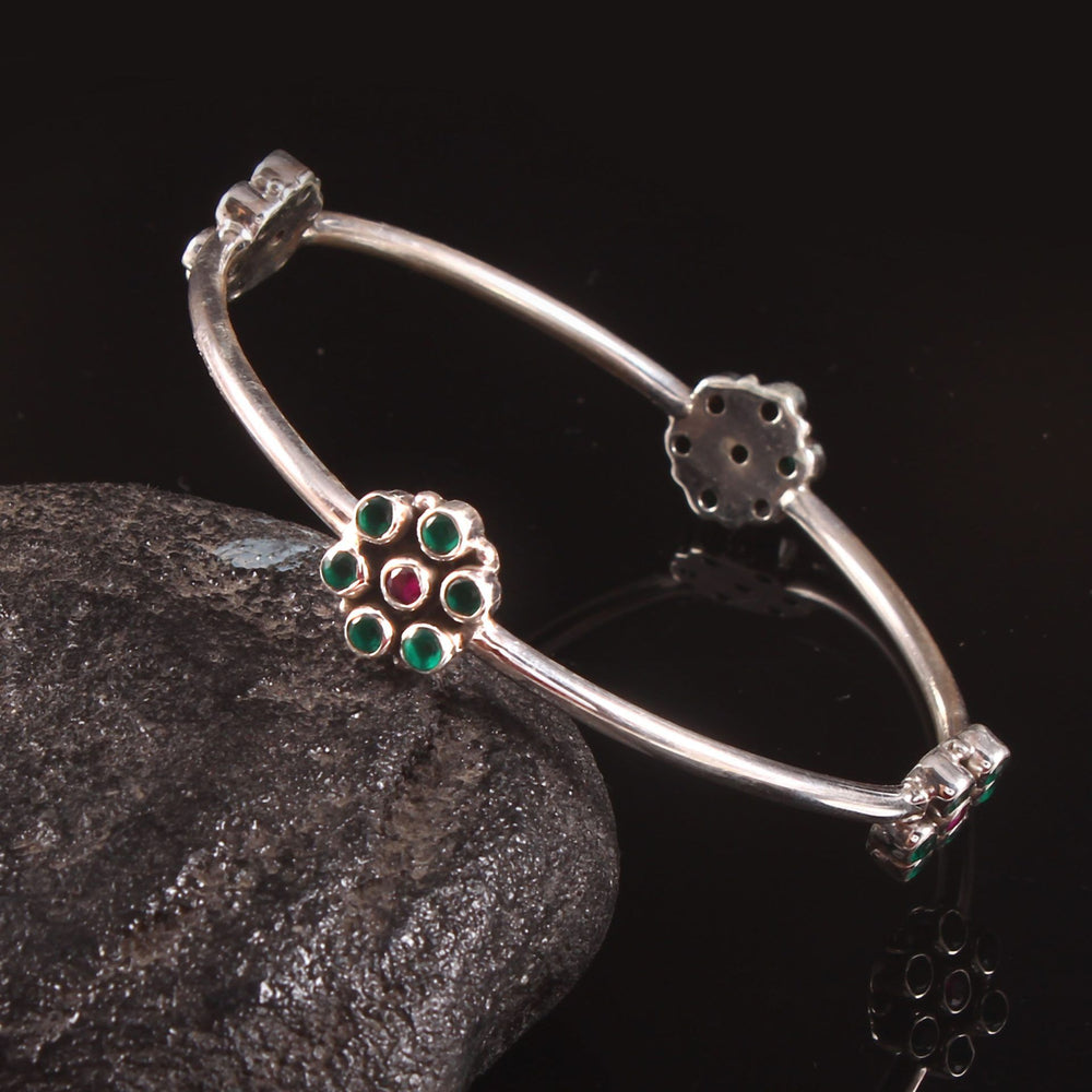 This Bangle Is Handmade in Silver, Floral Design, Embellished Green Gemstone.