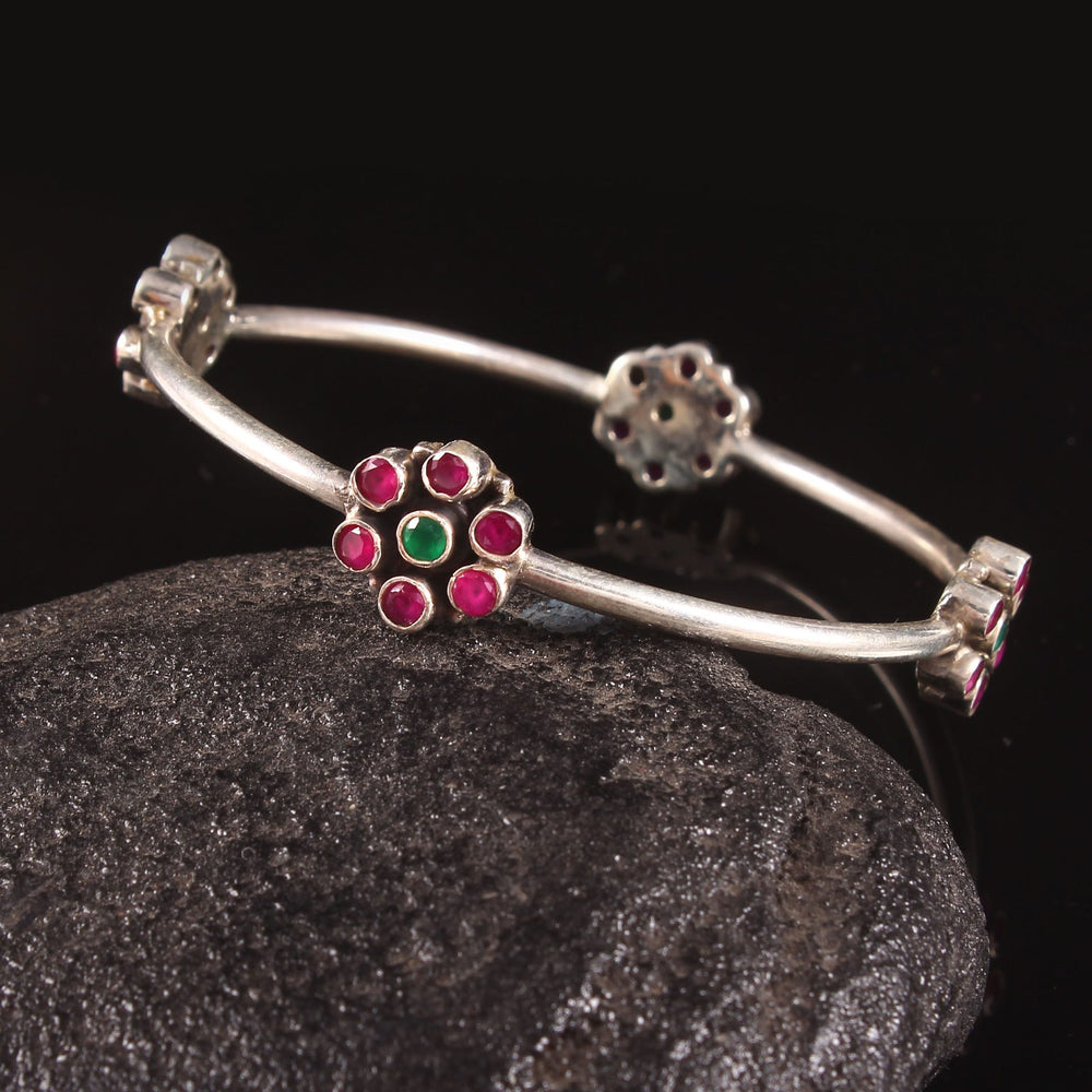 This Bangle Is Handcrafted in Silver, Embellished Pink Gemstone, Floral Design.