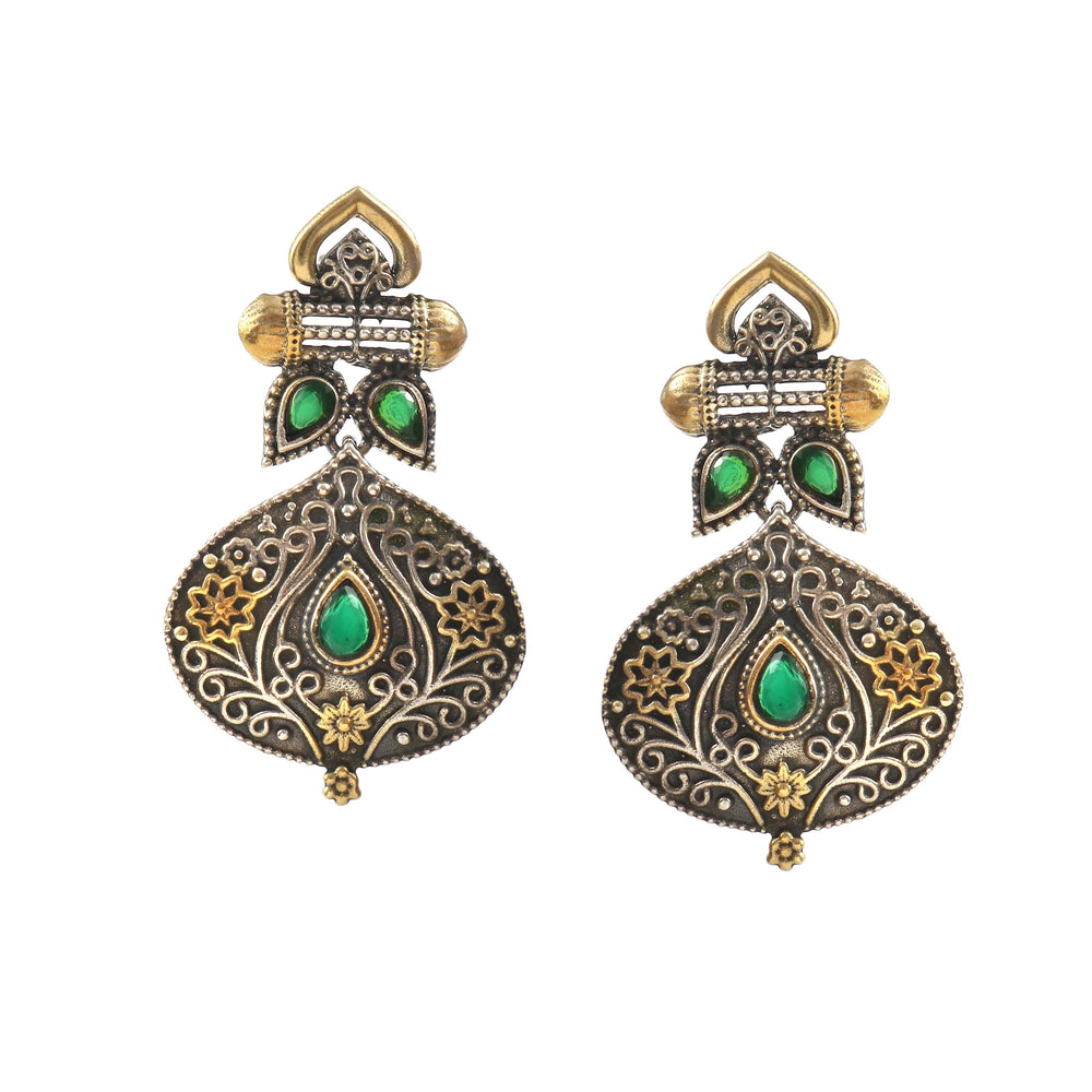 These Earrings Are Handcrafted In Silver, Embellished Green Stone & Tear-Drop Design