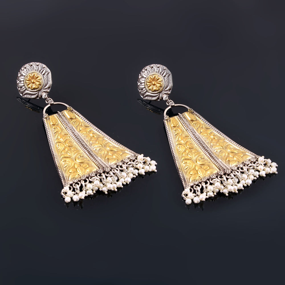 These earrings are Handcrafted In gold-plated silver, Embellished Fresh Water Pearls, and floral Design.