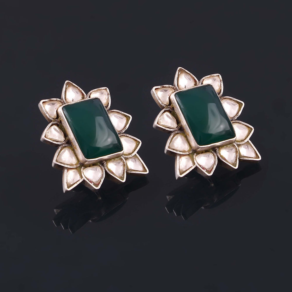 These Stud Earring Is Handcrafted in Silver, Embellished Emerald Gemstone & Kundan Work.