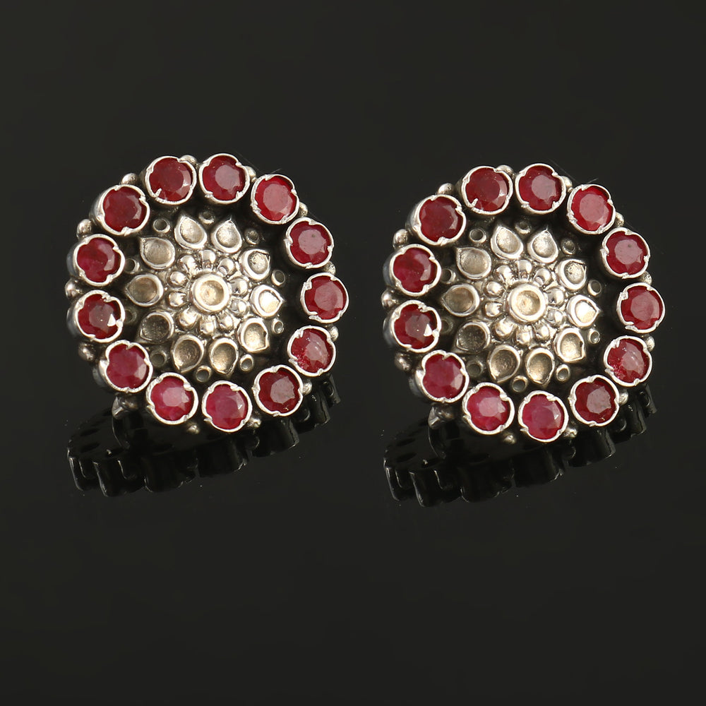 These Earring Are Handcrafted In Silver, Embellished Ruby In Flower Design.