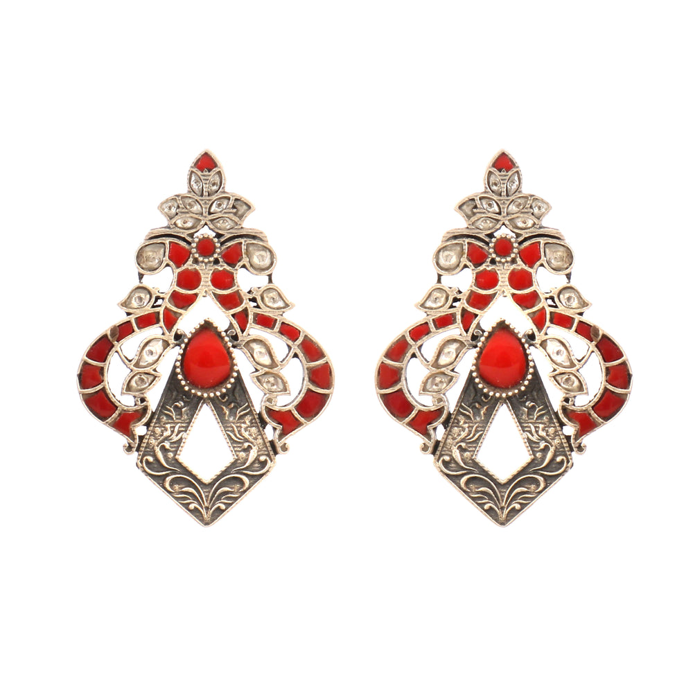 Peacock Earrings are Handmade in Silver, Embellished Kundan-Jadau Work