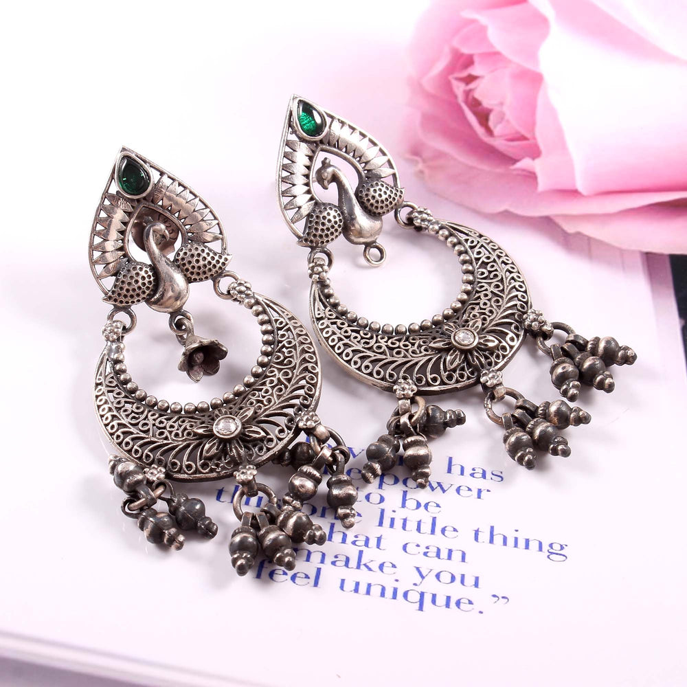 These Ghungroo earrings are crafted In Silver and Embellished Green Onyx, Peacock Design, and Rawa Work.