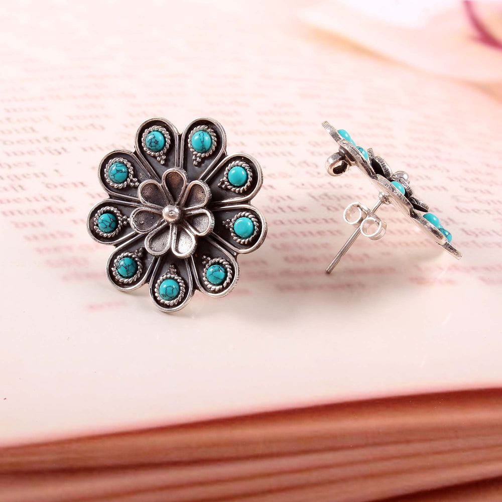 These Stud earrings are Handcrafted In Oxidized Silver, Turquoise Onyx Embellished With Floral Design.