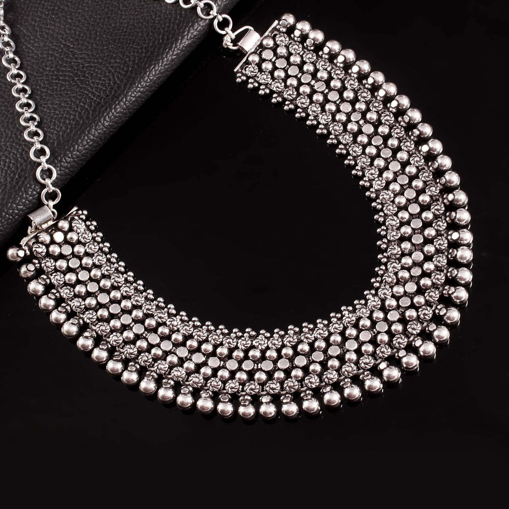This Chain Necklace Is Handcrafted In Oxidized Silver, Embellished Rawa Work & Floral Design.