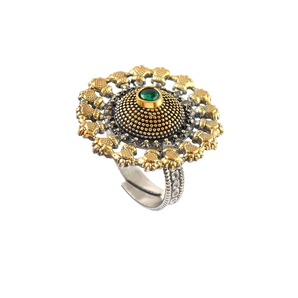 This Ring Is Handmade in Silver, Floral Design & Embellished Green Stone
