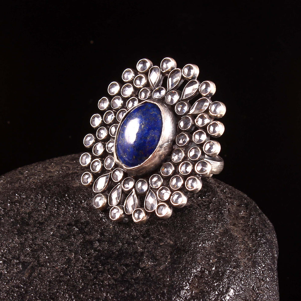 This Ring Is Handcrafted in Silver, Embellished Blue Gemstone & White Checker, Floral Design.