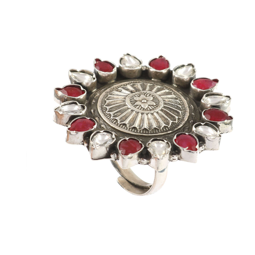 This ring is handcrafted in oxidized silver, embellished kundan-jadau in floral design.