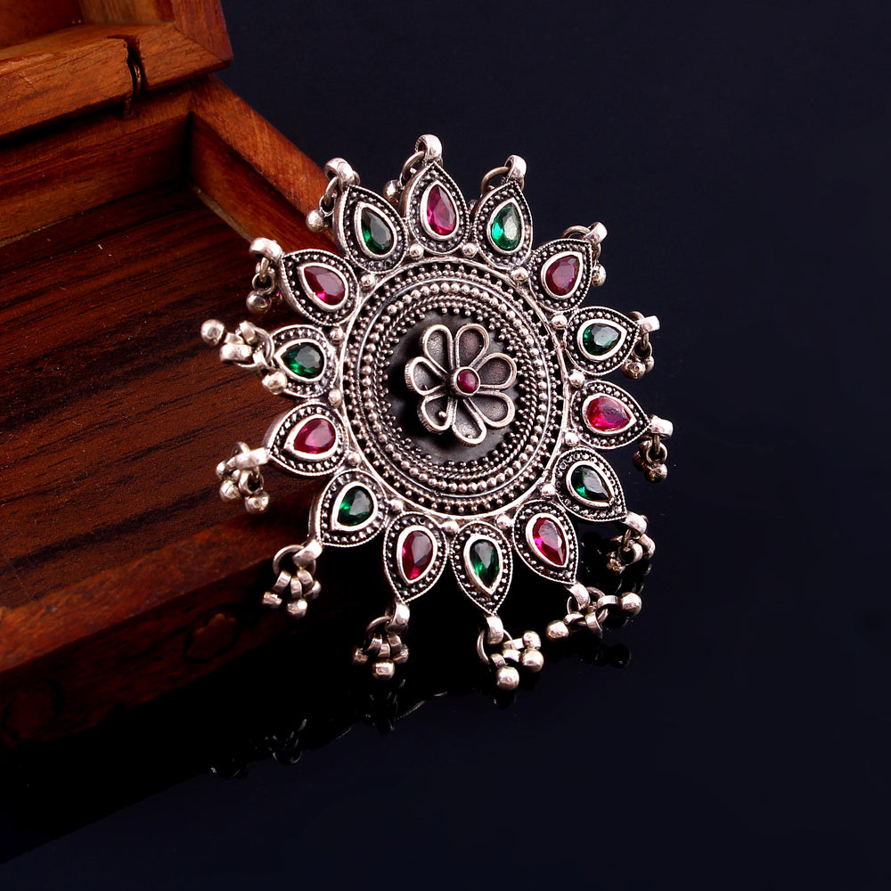 This sophisticated piece brings together traditional and modern styles with its intricate silver floral design and traditional ghungroo details. The adjustable design offers a comfortable fit for any finger size. Make a statement with this stylish and timeless ring.