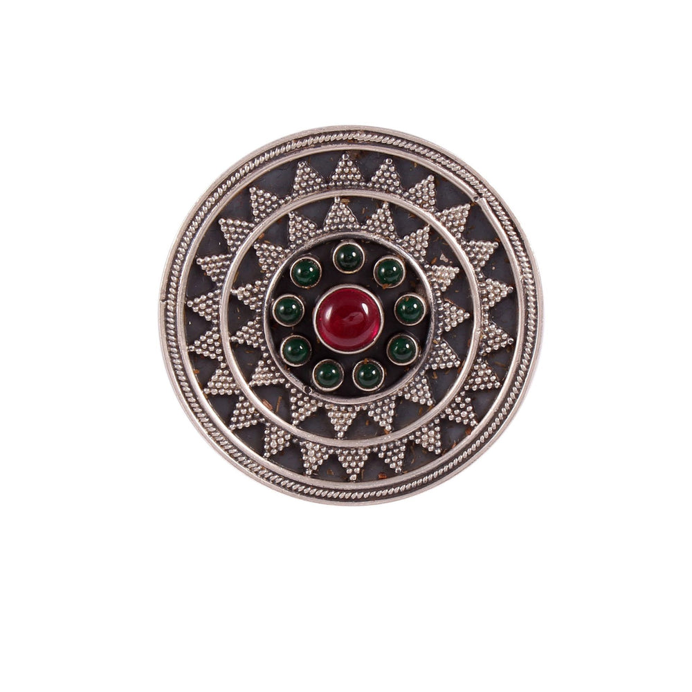This Ring Is Crafted in Oxidized Silver, Sun-Floral Design and Embellished Pink and green Gemstone with Rawa Work.
